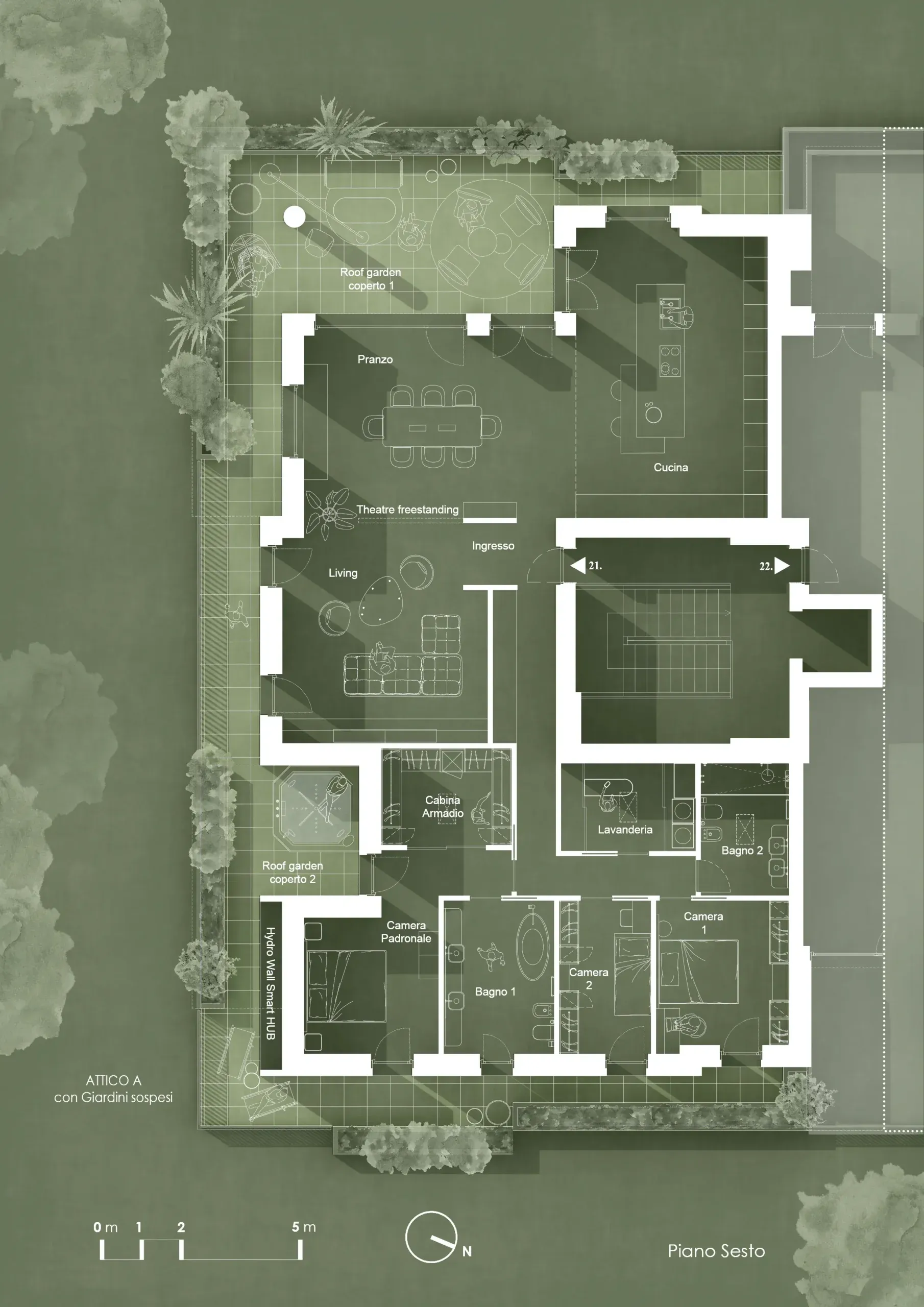 La residenza più prestigiosa, ampia zona living open space dedicata al soggiorno e al pranzo, grande cucina abitabile, ingresso, disimpegno, tre camere, due bagni, una lavanderia, due roof garden esterni coperti, di cui uno attrezzabile con tavolo da pranzo e salotto, collegati da balconi con “giardini sospesi”, locale tecnico esterno per apparecchiature impianti. Possibilità di autorimessa, cantina e posto auto scoperto.